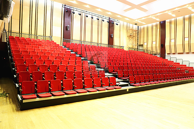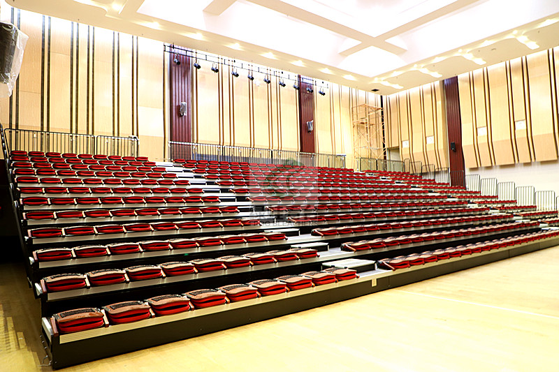 该看台为电动伸缩看台,配置前置式包棉软包座椅,带扶手,为满足客户特殊需求,在座椅背面增加网兜设计。看台整体与多功能厅其他设施搭配合理,整体美观大方。