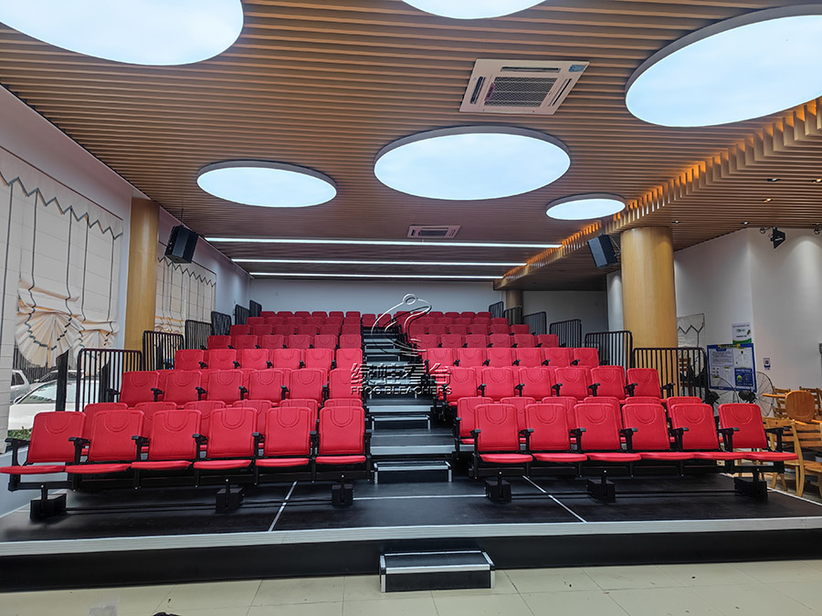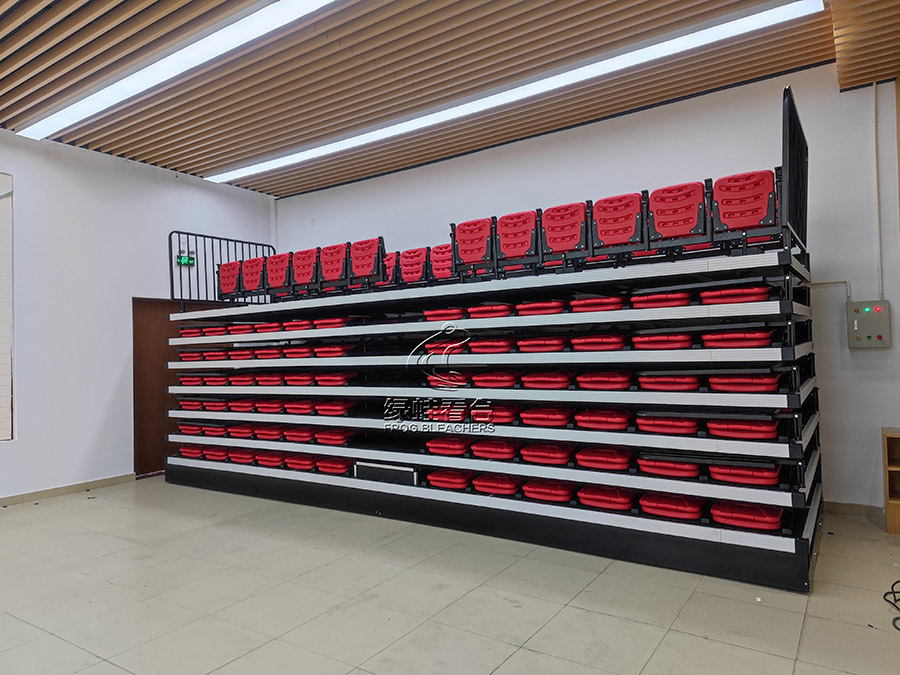 本次绿蛙看台承办南华小学安装电动伸缩看台项目,共安装 170位,为一层双排后置式吹塑座椅。可以根据不同的用途和功能进行调节,很方便快捷,不使用的时候折叠起来就可以了,不用耗费很大的存储和运输方面的成本。