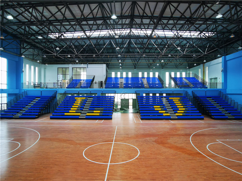 5、伸缩看台活动部份位置需作加固处理,地面需承载400kg以上,所有看台部份需铺木地板(或作其它处理能达到使PU轮及高强度轮负载转动的摩擦),看台尾层位置需打膨胀螺栓。