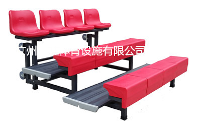 此看台采用钢为支撑架,铝材为双踏板,可以适应高强度的踩踏。前两排座椅选用无靠背吹塑条凳,后一排采用中靠背吹塑椅,满足了坐感的舒适要求。看台侧向装有万向轮,翻起看台可以移动。使用和储存都很便捷。