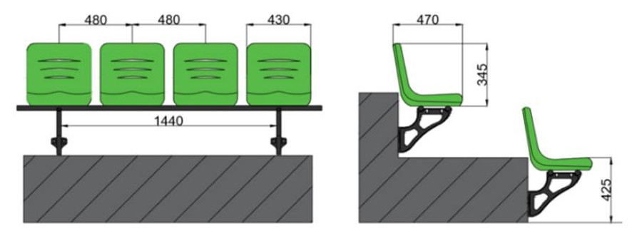 座椅的靠背处有号码牌预留位,座板后端中间处有漏水孔。这样在室外的看台不会因为下雨存水。