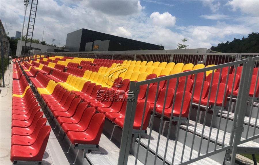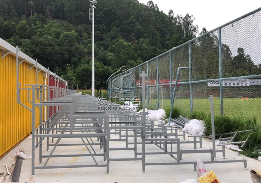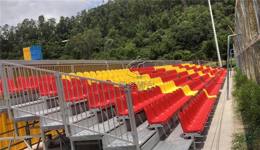 传统的看台大多采用水泥台阶或其他固定建筑结构,在此基础上安装塑料座椅。绿蛙金属看台采用金属支架作为支撑平台,在金属框架上安装塑料座椅。金属看台的优点是选择灵活,可适应不同的场地,看台的安装相比水泥固定台阶更方便,造价更低。看台不需要时拆卸也相对简单,不至于对场地结构造成太大的破坏(Frogsports)。