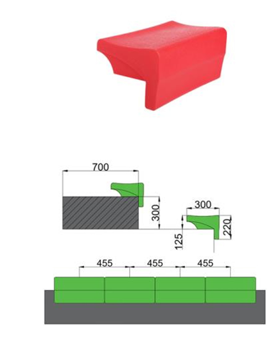 活动看台座椅采用平靠背中空吹塑座椅,前置式安装。座椅透过两块金属连接片上的安装孔将座椅安装在看台的踏板上。