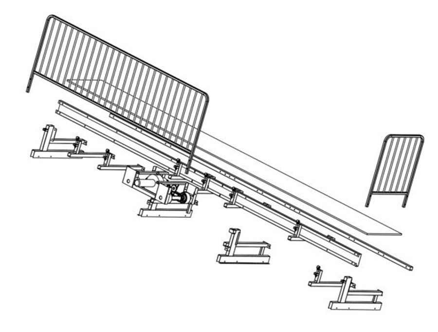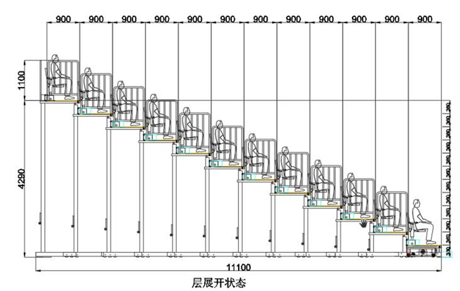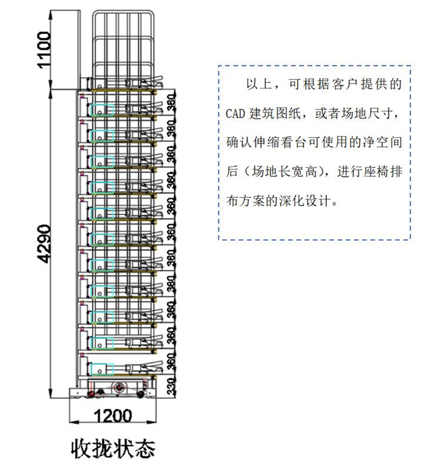 (2)看台整体为垂直支撑结构。看台层宽900mm;首层高330mm,其他层高300mm-360mm。(伸缩看台为定制产品,可根据实际场地和客户需求,略微调整尺寸。)