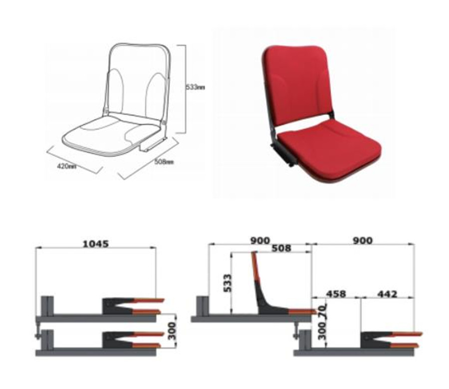 3)座椅尺寸:活动看台座椅采用高靠背包棉翻板折叠座椅,前置式安装。座椅背高533mm,座深508mm,座宽420mm。允许±10mm偏离。以下为伸缩看台座椅尺寸示意图。请提交样品。