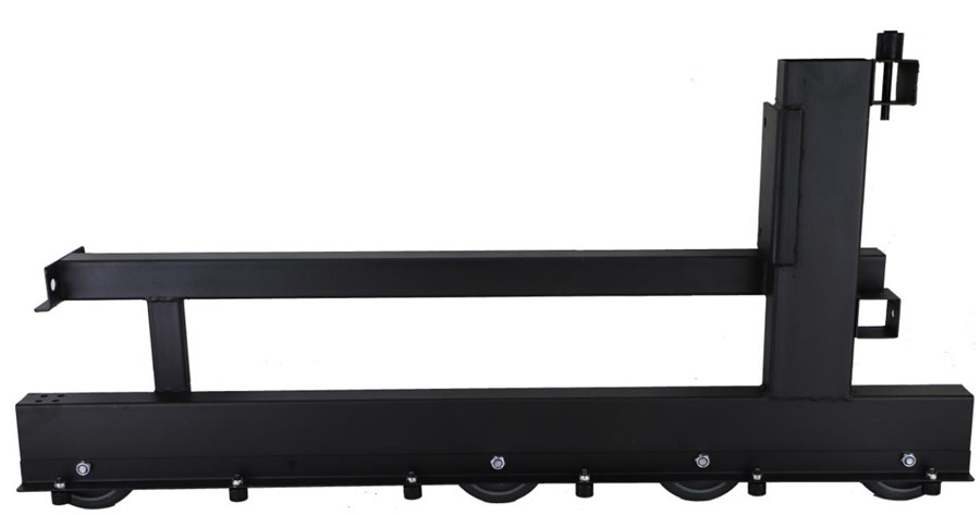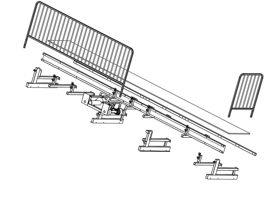 (6)看台床架结构的下部行走机构(走轮架)需带纠偏卡槽,床架结构中每排行走脚轮部分应有自动锁定装置,以保证伸缩看台顺序展开及收合,且展开后不会出现意外收合情况。看台床架结构的下部行走机构(走轮架)由3mm钢板折弯成“几”字形,走轮架一侧折成凹型卡槽,另一侧折边必须安装数量不少于5个的可转动的塑胶轮,塑胶轮与相邻的走轮架凹型卡槽咬合,保证看台在伸缩过程中流畅自如。整体安装要求在2000次展开和收拢后,伸缩轨道仍具有适用性。走轮架截面示意图: